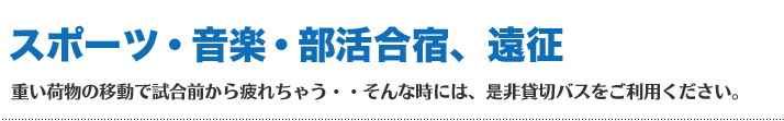 合宿には大量の荷物がつきものですよね? 選手や学生の方たちも試合に集中したいのに 重たい荷物を持ちながらの移動ばかりで試合前から疲れちゃう、、 そんな時には、是非貸切バスをご利用ください。 試合会場や宿泊先までの移動もスムーズにできます。